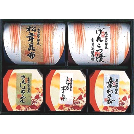 内容:松茸昆布200g、げんこつ漬け(西瓜の醤油漬け)200g、山椒ちりめん70g、ししゃもきくらげ100g、葉わさび130g