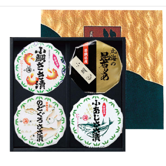 若狭の名産品「小鯛ささ漬」に「のどぐろ」と「あじ」、「小鯛昆布〆」がセットに。
